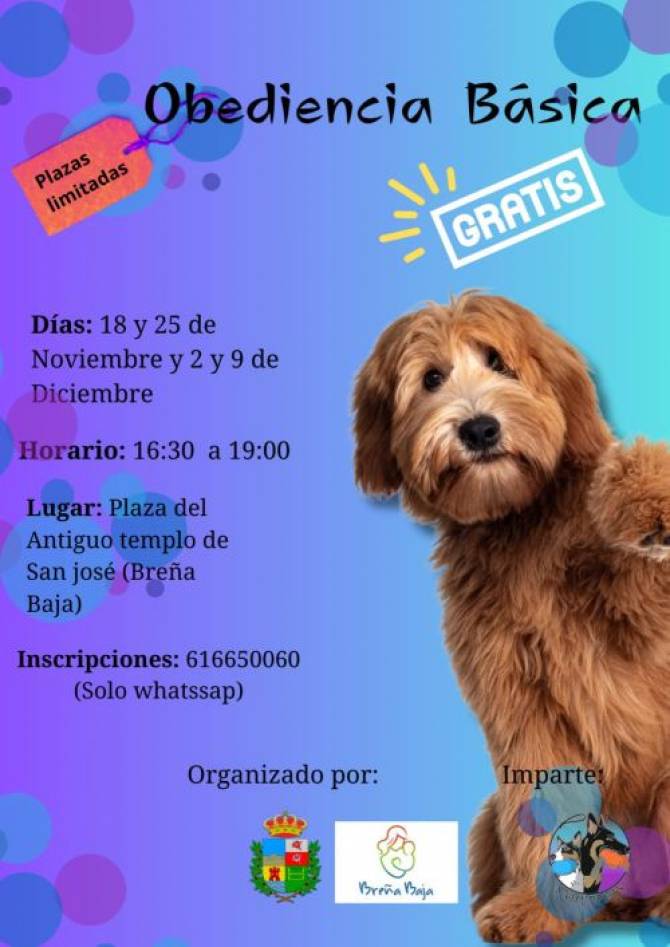Los sábados 18 y 25 de noviembre y 2 y 9 de diciembre en el Recinto Municipal de San José tendrá lugar un Curso sobre “Obediencia Básica” canina por parte del Club Snouppets y el Ayuntamiento de Breña Baja. Con horario de 16.30 a 19 hs