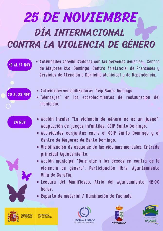 El Ayuntamiento de la Villa de Garafía a través de la concejala de Igualdad, Daina del Arco Iris Sgobino Gallizio, ha informado que el municipio cuenta con una amplia programación para conmemorar el 25 N, Día Internacional para la Eliminación de la Violencia Contra las Mujeres.