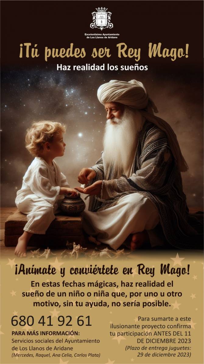 El Ayuntamiento de Los Llanos de Aridane retoma el proyecto ‘¡Tú puedes ser un Rey Mago!. Se trata de una iniciativa solidaria que busca que ningún niño ni niña se quede sin su regalo de Navidad. Las personas interesadas en colaborar deben contactar al departamento municipal de Servicios Sociales.