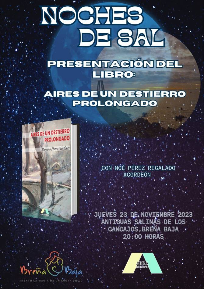 El jueves 23 de noviembre, a las 20 h, en las Antiguas Salinas de Los Cancajos, el escritor y traductor Mariano Flores Martínez presentará su libro «Aires de un destierro prolongado» en el marco de las Noches de Sal. Noé Pérez Regalado amenizará el evento con su acordeón