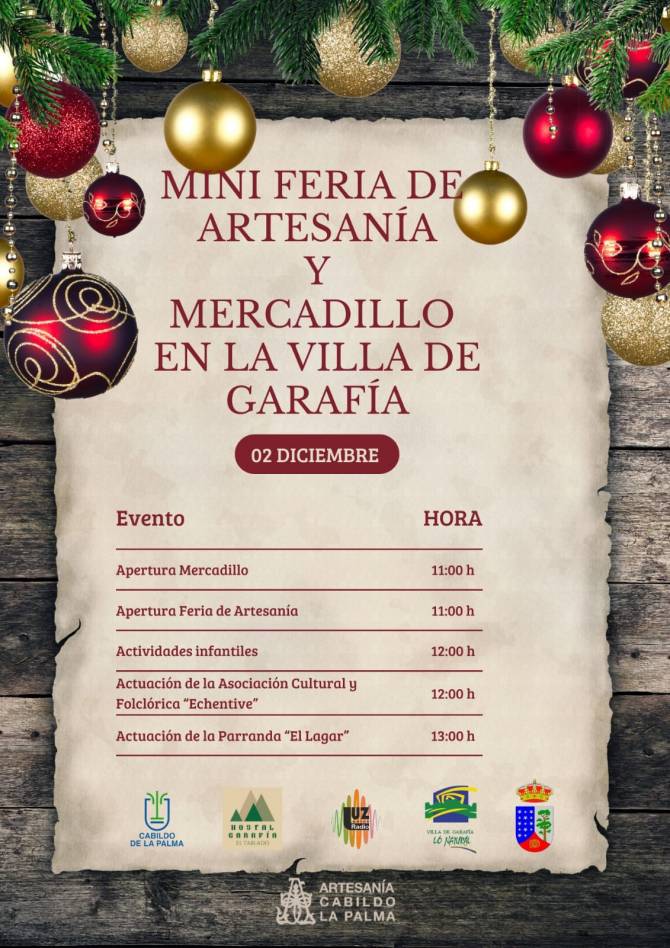El Ayuntamiento de la Villa de Garafía a través de la concejala de Sector Primario, Lorena Rodríguez, y la concejala de Artesanía, Daina del Arco Iris Sgobino Gallizio, han informado que el próximo sábado, 2 de diciembre, el municipio acogerá el Mercadillo y la Mini Feria de Artesanía, "que por primera vez se realizarán en el mismo espacio".