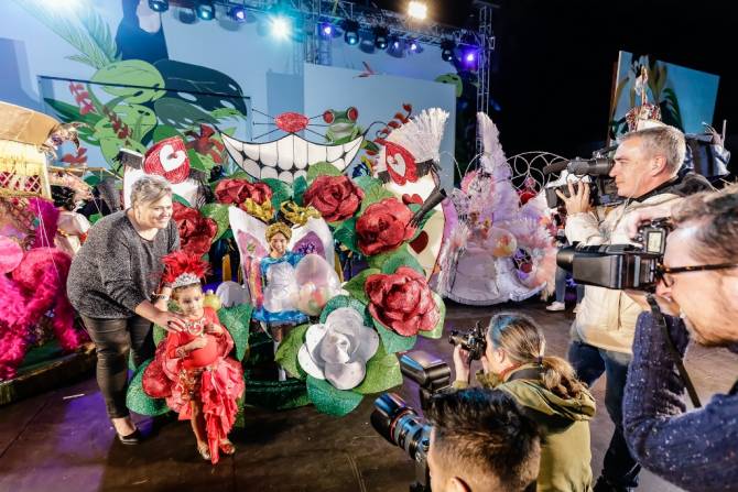 La pequeña, Adriana Medina Pais, con su fantasía Con luz y color este mundo de maravillas ha de sacar su color, fue proclamada Reina Infantil del Carnaval de Los Llanos de Aridane en la gala de elección celebrada esta tarde en la Plaza Juan Pablo II y en la que recibió el cetro de la mano de la alcadesa, Noelia García y la reina infantil saliente, Jaquelin León. Adriana lució un diseño de Yordi Melián ambientado en el popular cuento infantil de Alicia en el País de Las Maravillas, al que la pequeña supo sacar partido sobre el escenario recreando incluso la conocida escena del conejo y su reloj.
