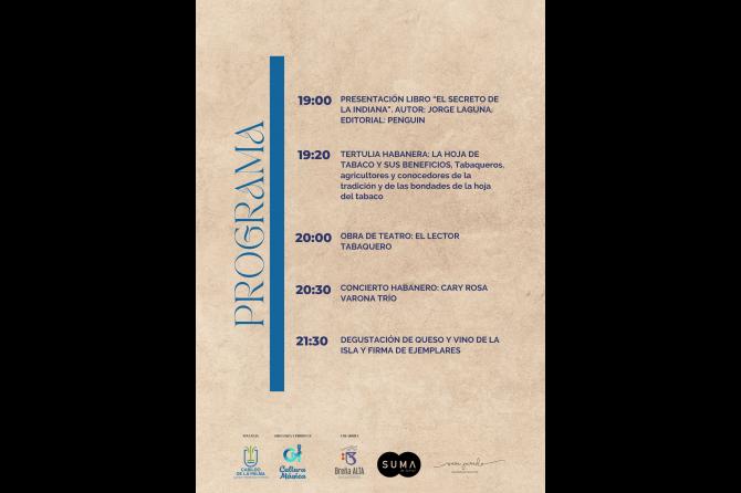 El evento, que dará comienzo a las 19:00 con la presentación de la novela de la mano de su autor y moderada por María José Manso, directora de isLABentura Canarias, continuará con una tertulia habanera moderada por Carmen Concepción, exdirectora del Museo del Puro y varios tabaqueros de la isla, donde se hablará de la importancia de recuperar antiguos oficios y poner en valor un sector tan importante a nivel histórico y cultural como es el sector tabaquero en la isla de La Palma. Seguidamente, tendrá lugar la representación teatral “El lector tabaquero”, con la lectura de un fragmento de la obra de Jorge Laguna, y el concierto de Cary Varona Trío, intérprete y compositora cubana nominada a un Grammy. Para finalizar, habrá una firma de ejemplares y degustación de vino y quesos de la isla.