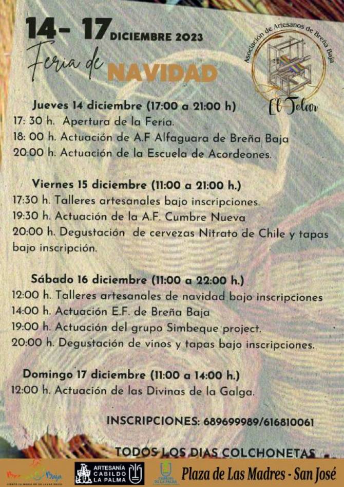 Del 14 al 17 de diciembre en la Plaza de Las Madres de San José tendrá lugar la “Feria de Artesanía” que organiza el Ayuntamiento de Breña Baja, conjuntamente con la asociación artesanal “El Telar” de Breña Baja, por estas fechas navideñas. Cuenta con la colaboración de la Consejería de Artesanía del Cabildo Insular de La Palma.