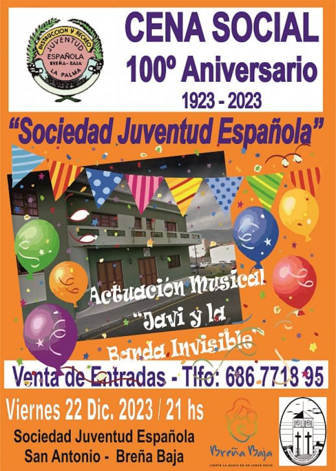 21,00 H. CENA SOCIAL a cargo de la Asociación de Vecinos Antomara de San Antonio. Sociedad Juventud Española, San Antonio. Reservas y venta de entradas en el número de teléfono 686 771 895. Al finalizar Actuación musical con “Javi y la Banda Invisible”