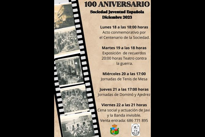 18,00 H. Apertura de los Actos conmemorativos por el centenario de la Sociedad Juventud Española. CHARLA “Una crónica de 100 años” a cargo del cronista oficial D. Julio Marante .