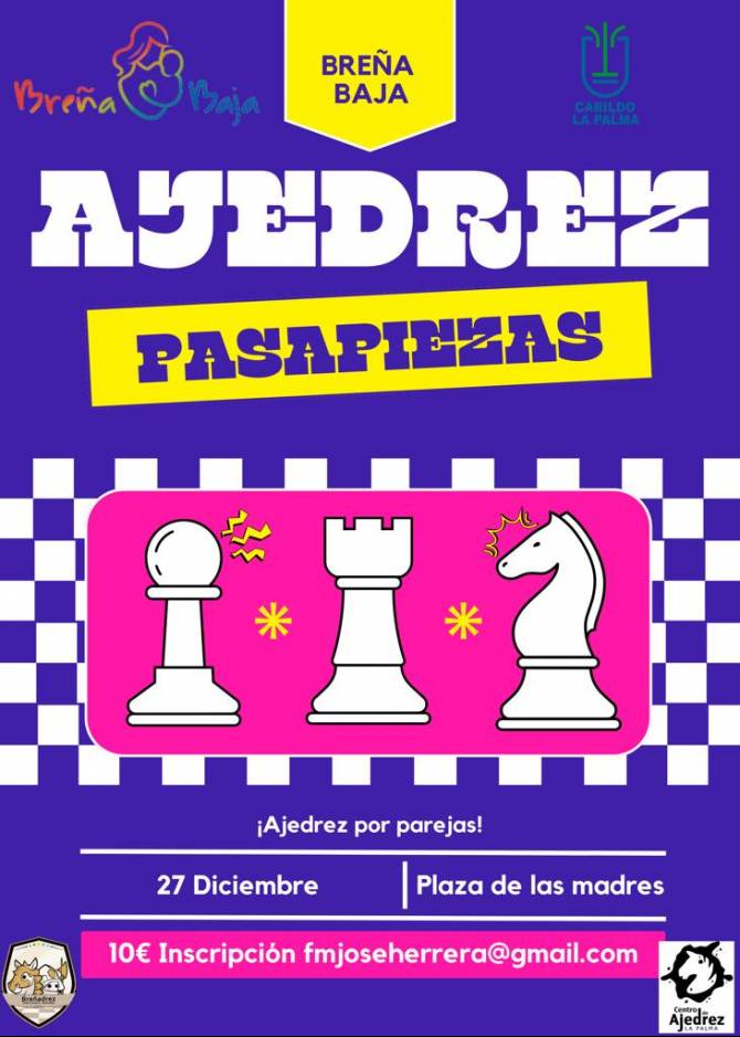 El miércoles 27 de diciembre, 16.00 h, tendrá lugar el Campeonato Insular Pasapiezas Navideño de Ajedrez de Breña Baja en la Plaza de Las Madres de San José que organiza el Club Breñadrez y colaboran el Ayuntamiento de Breña Baja, Cabildo Insular de La Palma y el Centro Insular de Ajedrez.