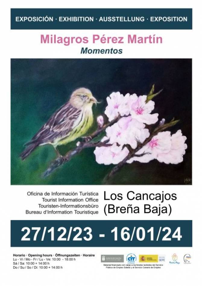 Del 27 de diciembre de 2023 al 16 de enero de 2024 Milagros Pérez Martín vuelve con una exposición de pintura al óleo bajo la denominación “Momentos” en la Oficina de Turismo de Los Cancajos con los horarios habituales de la oficina. Colabora Ayuntamiento de Breña Baja y el CIT Tedote, entre otros.