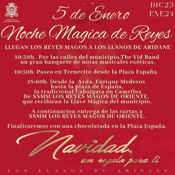 Ya está todo preparado para que Los Llanos de Aridane reciba a Sus Majestades los Reyes Magos de Oriente. Este viernes, 5 de enero, el Ayuntamiento celebra su tradicional cabalgata, en la que la ilusión y la magia de la Navidad serán protagonistas. Comenzará a las 17:30 horas en la Avenida Enrique Mederos.