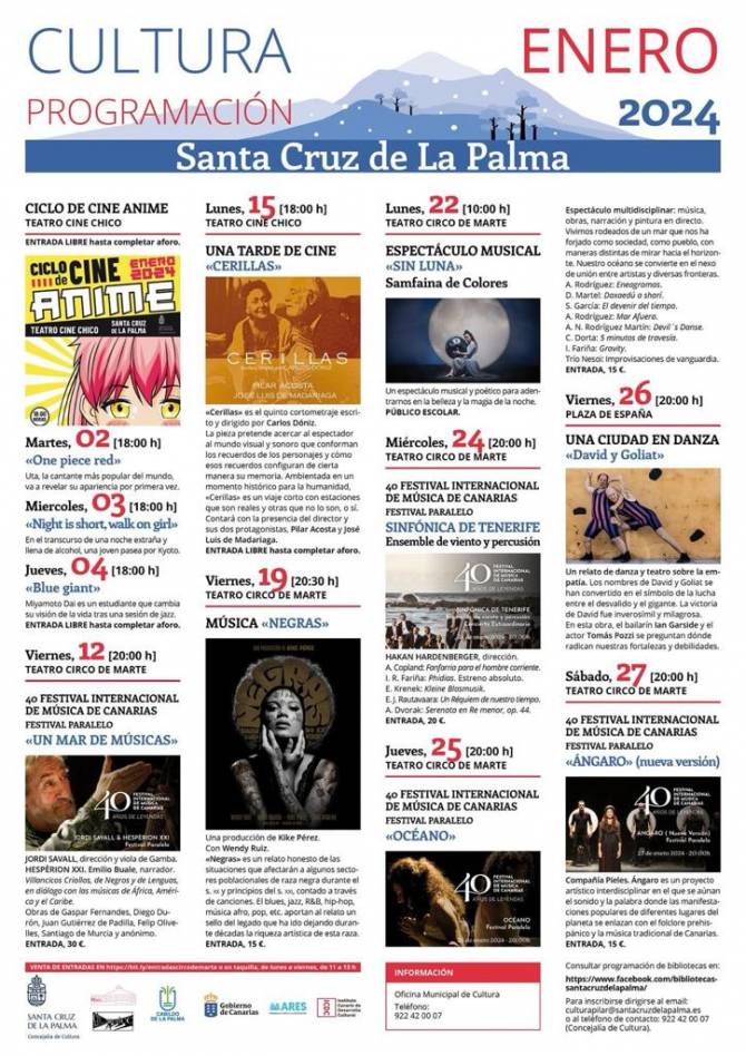 La concejalía de Cultura del Ayuntamiento de Santa Cruz de La Palma, que coordina Alberto Perdomo, ha preparado una completa agenda de propuestas para el primer mes de 2024 que contempla cine, teatro, danza y música hasta el próximo 27 de enero.