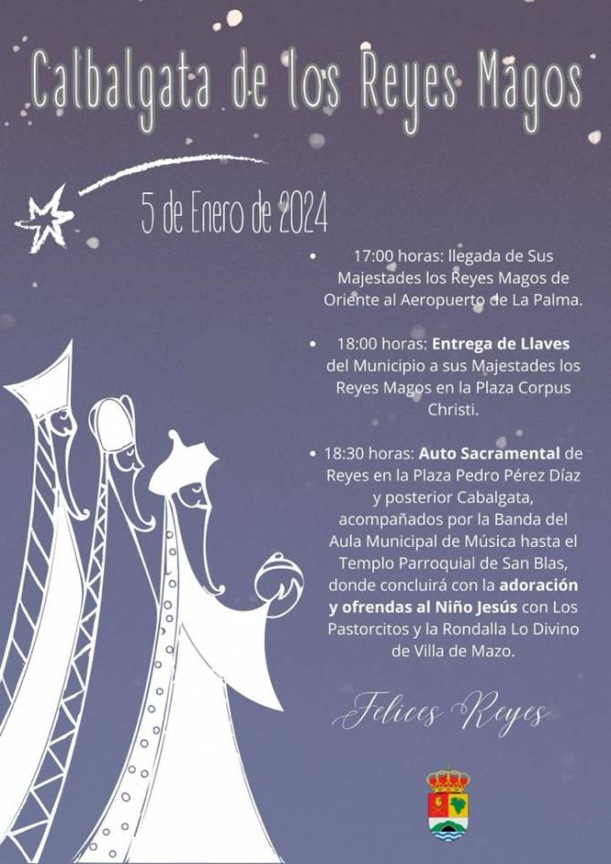 Se le hará entrega a los tres Reyes, a las 18:00 horas, de las llaves del municipio de Villa de Mazo en la Plaza del Corpus Christi para culminar, a las 18:30 horas, con el Auto Sacramental de Reyes en la Plaza Pedro Pérez Díaz y posterior Cabalgata por las Calzadas hasta el Templo Parroquial de San Blas en donde concluirá con la adoración y ofrendas al Niño Jesús.