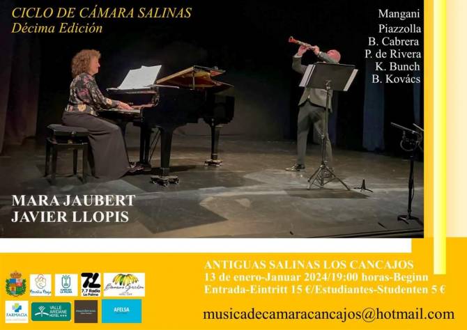 El 13 de enero, 19 hs, con Mara Jaubert y Javier Llopis que interpretarán un repertorio centrado en la música de P. de Rivera, Kóvacs, Bunch, Piazzolla, Mangani y otros