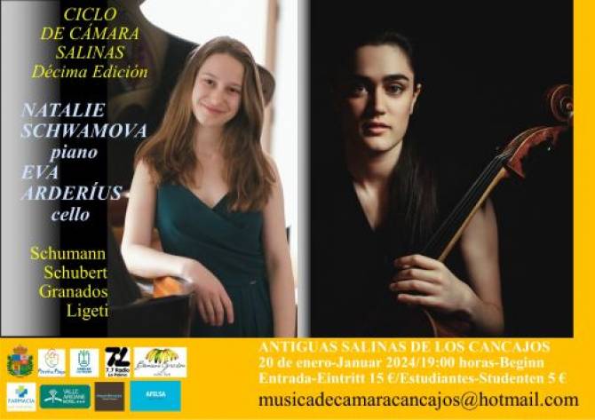 El sábado 20 de enero a las 19 hs, en las Antiguas Salinas de Los Cancajos tendrá lugar el segundo concierto del Ciclo de Cámara Salinas en su décima edición, con un concierto de piano y violonchelo de Eva Arderíus y Natalie Schwamova.