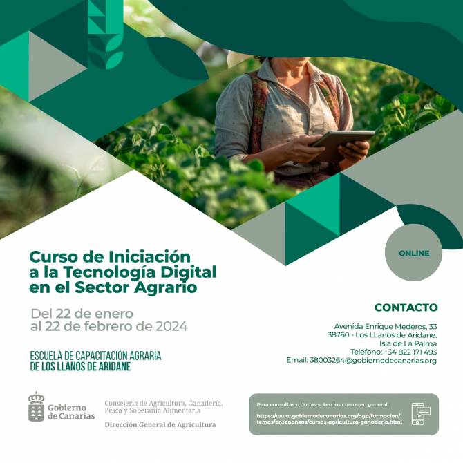 La Dirección General de Agricultura ha abierto el plazo para inscribirse en el curso online 'Iniciación al uso de la tecnología digital en el sector agrario' que se imparte en la Escuela de Capacitación Agraria (ECA) de los Llanos de Aridane -adscrita de la Consejería de Agricultura, Ganadería, Pesca y Soberanía Alimentaria del Gobierno de Canarias- del 22 de enero al 22 de febrero de 2024.