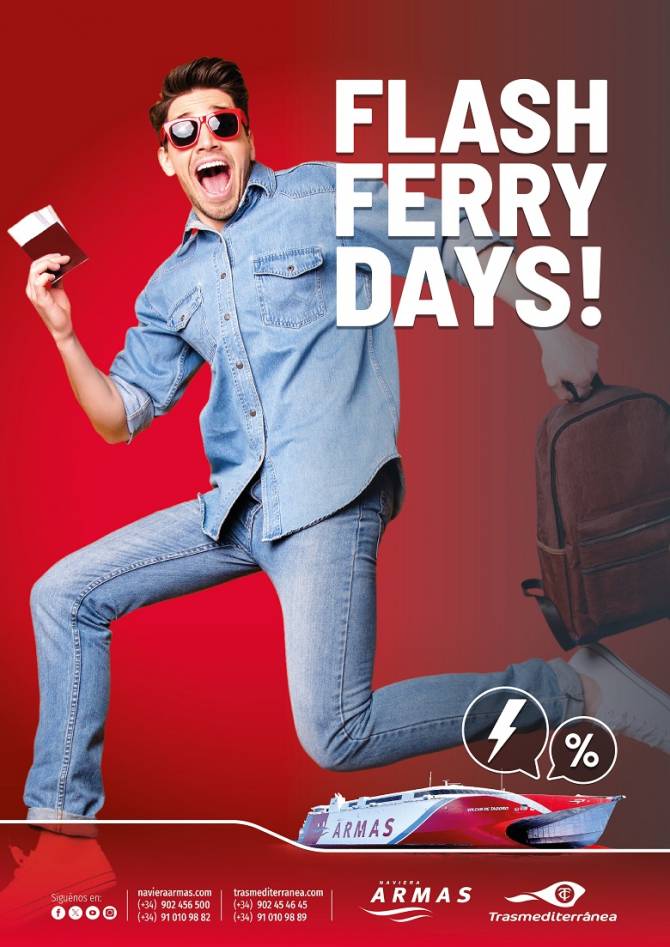Con motivo de la Feria Internacional de Turismo, FITUR, que se celebrará en Madrid del 24 al 28 de enero, Grupo Armas Trasmediterránea anuncia el lanzamiento de los Flash Ferry Days a lo largo de año. Se trata de acciones promocionales aleatorias, con precios muy especiales sobre las tarifas vigentes, y se anunciarán por sorpresa para incentivar el uso de sus servicios en determinadas líneas, horarios y épocas del año.