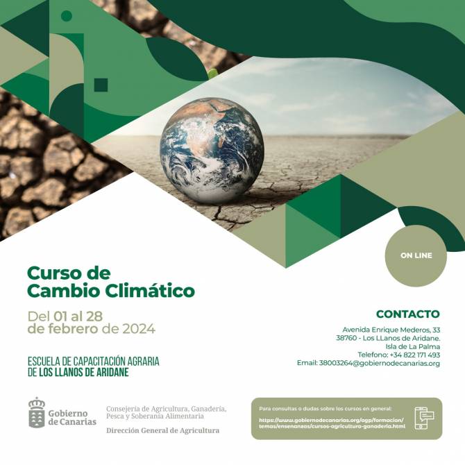 La Dirección General de Agricultura ha abierto el plazo para inscribirse en el curso online sobre el cambio climático que se impartirá en la Escuela de Capacitación Agraria (ECA) de los Llanos de Aridane -adscrita de la Consejería de Agricultura, Ganadería, Pesca y Soberanía Alimentaria del Gobierno de Canarias- del 1 al 28 de febrero de 2024.