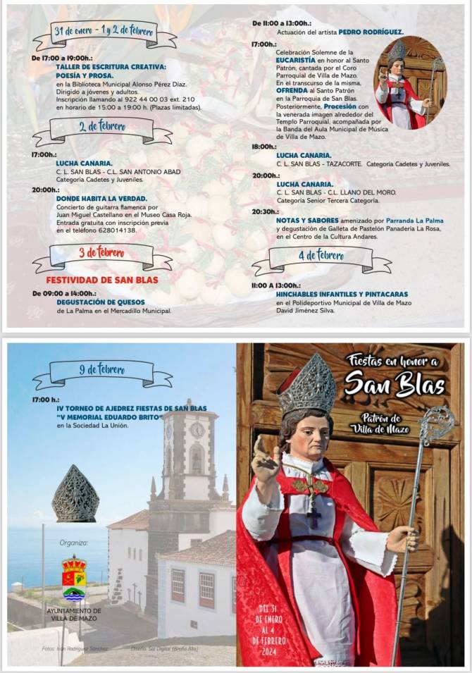 La eucaristía contará con la actuación del Coro Parroquial de Villa de Mazo y posteriormente tendrá lugar la tradicional procesión de la imagen de San Blas, acompañada por la Banda del Aula Municipal de Música del municipio.