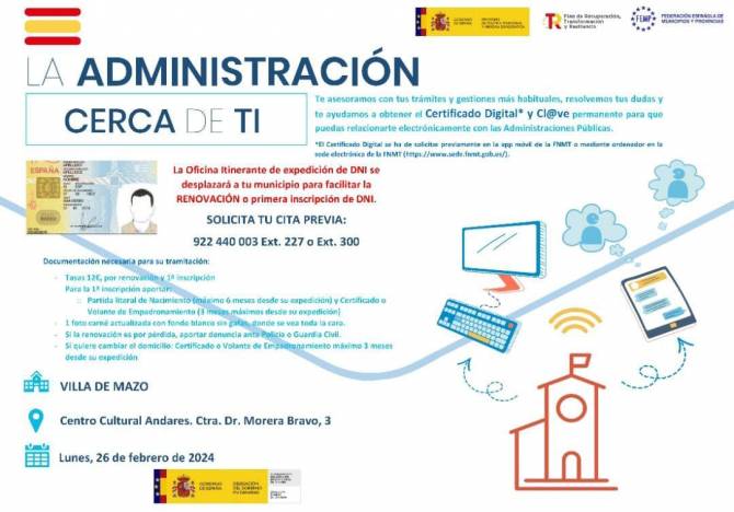 El Ayuntamiento de Mazo, en el marco del convenio entre la Administración General del Estado (Ministerio de Política Territorial y Memoria Democrática) y la Federación Española de Municipios y Provincias, pone en marcha un proyecto de acercamiento de la Administración a la ciudadanía del mundo rural mediante la oficina itinerante del DNI durante el año 2024.