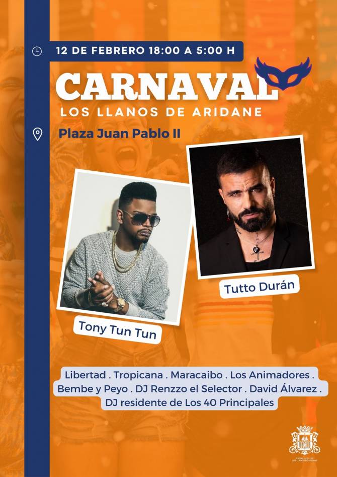 El carnaval de Los Llanos de Aridane vivirá uno de sus días clave el próximo lunes 12 de febrero, con un evento que combina los sonidos de la tradicional verbena con varios artistas del género urbano. Todo esto encabezado por el cantante puertorriqueño Tony Tun Tun.