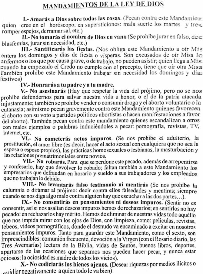 Entre los mandamientos impartidos, se destaca la condena hacia aquellos que creen en determinadas prácticas como las supersticiones, catalogando como pecaminoso el seguir determinadas creencias. Además, se señala una interpretación restrictiva sobre la obligación de asistir a misa, imponiendo condiciones que no se ajustan a los principios de libertad religiosa y de conciencia.