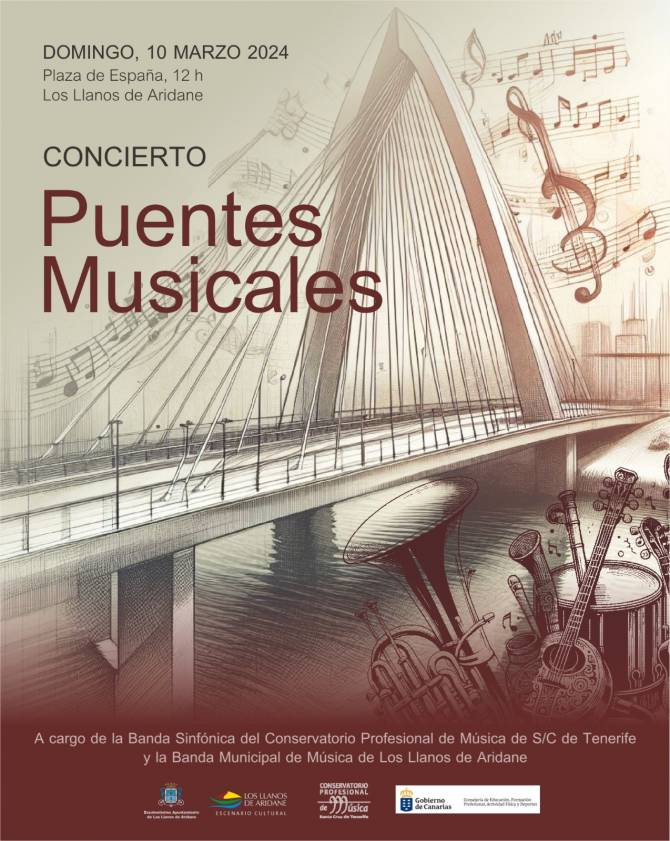 La Banda Municipal de Música de Los Llanos de Aridane y la Banda Sinfónica del Conservatorio Profesional de Música de Santa Cruz de Tenerife protagonizan el concierto Puentes Musicales. Tendrá lugar este domingo, 10 de marzo, a las 12:00 horas en la Plaza de España.