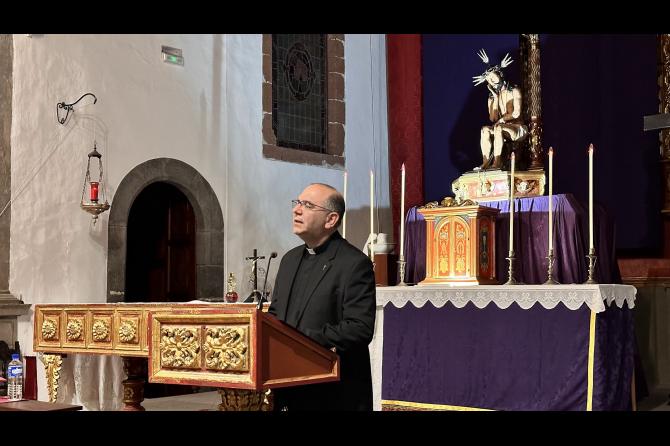 La Corporación municipal, junto a diferentes autoridades insulares y regionales, asistieron a la iglesia de San Francisco, que desde las 20:00 horas acogió al público asistente para escuchar la reflexión y las palabras del periodista nacido en la capital palmera, y que en la actualidad es un referente de las artes escénicas de Canarias en su faceta como escritor.