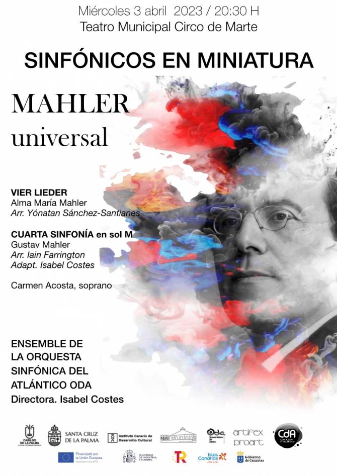 El programa del concierto del día 3 de abril 'Mahler Universal' (19:00 horas), que cuenta este año con la presencia de la gran soprano tinerfeña Carmen Acosta, será protagonizado por un ensemble de la Orquesta Sinfónica del Atlántico (ODA) bajo la dirección de la maestra Isabel Costes, que interpretará un repertorio integrado por la obra 'Vier Lieder', de Alma María Mahler y la 'Cuarta sinfonía en sol M' de Gustav Mahler.