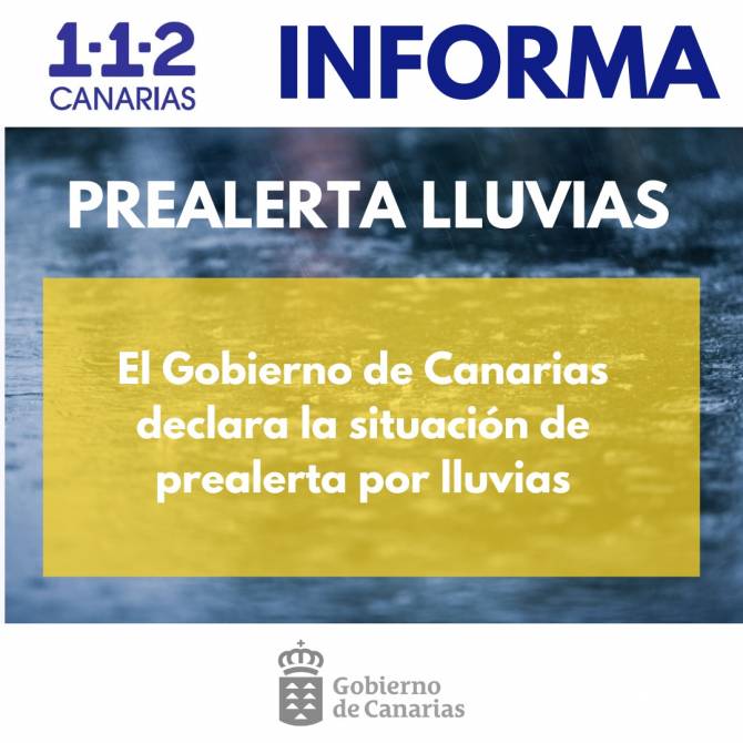 La Dirección General de Emergencias, del Gobierno de Canarias, ha declarado la primera prealerta por lluvias del año en todo el archipiélago, en base a la previsión de la Agencia Estatal de Meteorología, y otras fuentes disponibles, y en aplicación del Plan Específico de Emergencias de Canarias por Riesgos de Fenómenos Meteorológicos Adversos (PEFMA). Esta situación entrará en vigor a las 09:00 horas de mañana, viernes 22 de marzo, coincidiendo con el paso de una Depresión Aislada en Niveles Altos (DANA) por las islas que traerá inestabilidad durante varios días.