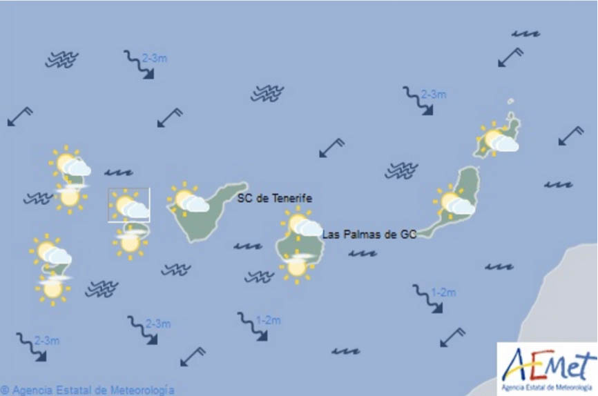 Igualmente se estiman que existirán intervalos nubosos durante la mañana en litorales Norte y Este, con probabilidad de calima que afectaría principalmente a medianías y zonas altas.