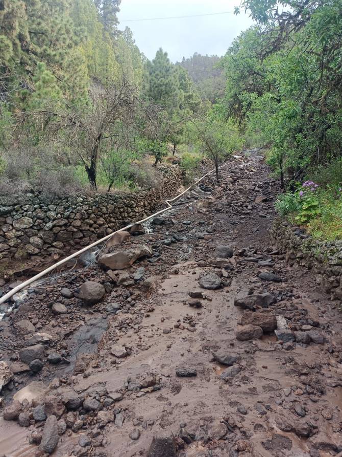 Precisamente, el presidente de la máxima institución palmera, Sergio Rodríguez, se trasladaba este fin de semana hasta el municipio, acompañado de Darwin Rodríguez, consejero de Infraestructuras, para conocer de primera mano el alcance de los daños, cuya causa ha vuelto a ser la escasa permeabilidad de los terrenos en las zonas altas, que fueron afectadas por el incendio de julio de 2023.