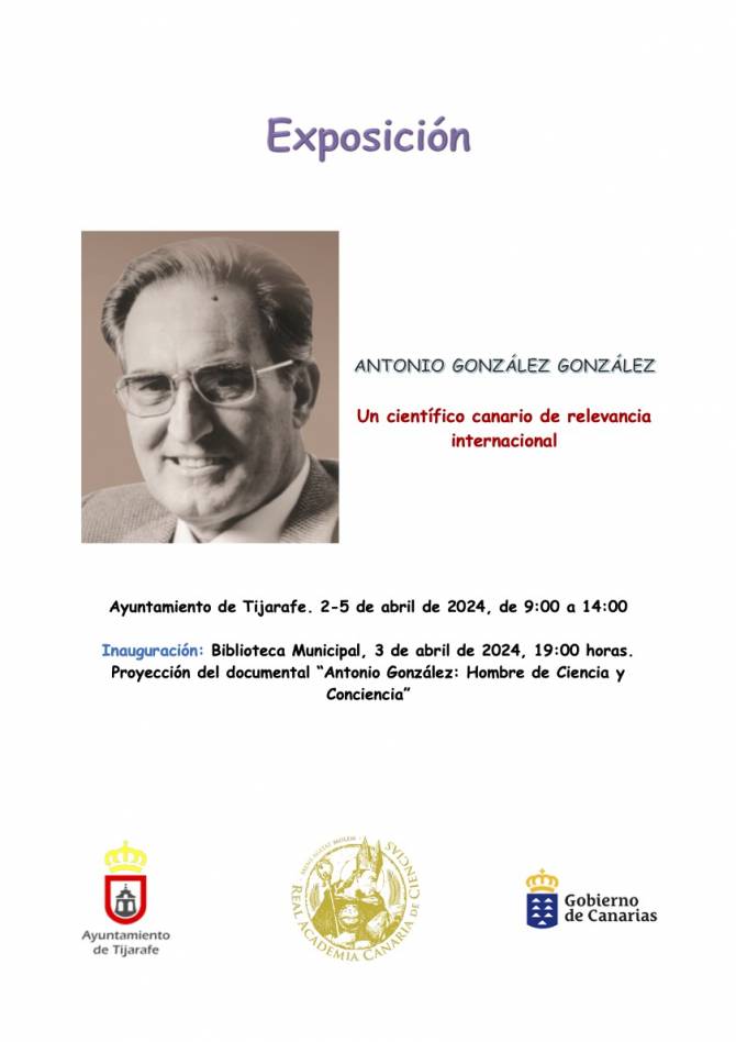 El 2 de abril, de 13:00 a 15:00 horas, el Dr. Juan Ramón Herrera Arteaga pronunciará dos conferencias al alumnado de secundaria del CEO Tijarafe. Mientras que el 3 de abril, a las 19:00 horas se inaugurará la exposición con la intervención del Dr. José Méndez Pérez y del Dr. Juan Ramón Herrera Arteaga. Acto seguido, en la Biblioteca Municipal se proyectará el documental “Antonio González González: Hombre de ciencia y conciencia”, producido por David Baute. Cerrará el acto Yaiza Cáceres Lorenzo, alcaldesa del Ayuntamiento de Tijarafe.