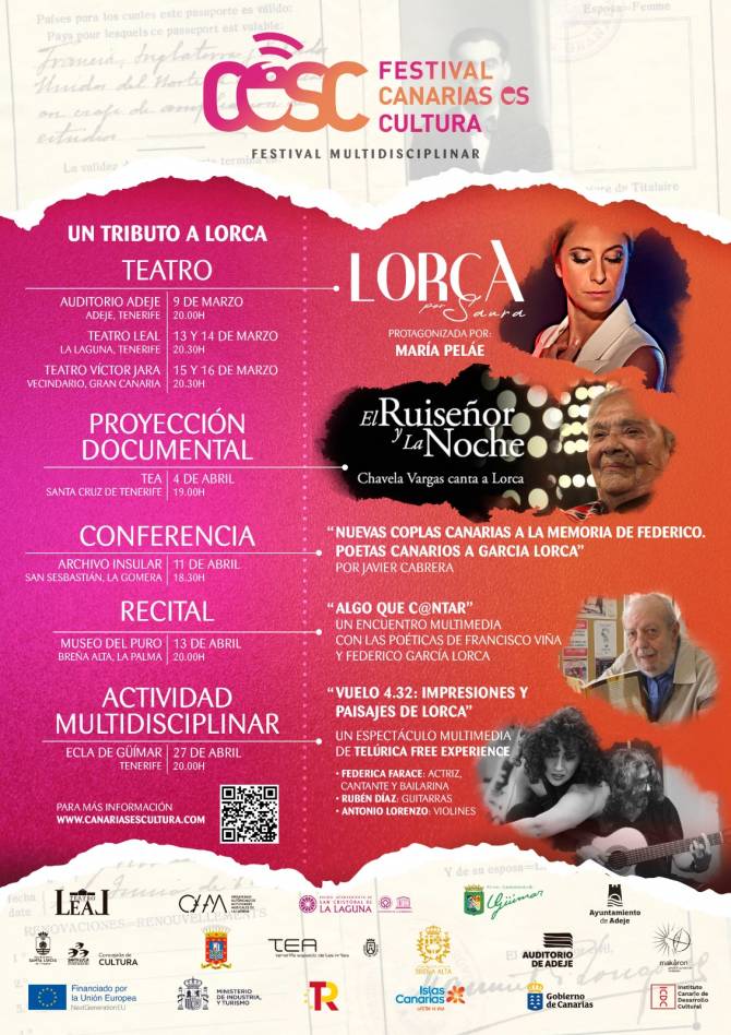 Tras el paso del huracán “Lorca por Saura” con cinco funciones casi llenas en el Archipiélago y en las que una incombustible María Peláe se ha metido en medio del pan de dos grandes de la Cultura en nuestro país, Federico García Lorca y Carlos Saura, la programación del Festival Canarias es Cultura (CesC), prosigue en abril con cuatro eventos más que elogian la figura del poeta que situó a España en el ámbito internacional hasta que fue fusilado en el marco histórico de la Guerra Civil que se saldaba en España del 36 al 39. El festival CesC está patrocinado por Promotur y por el ICDC del Gobierno de Canarias.