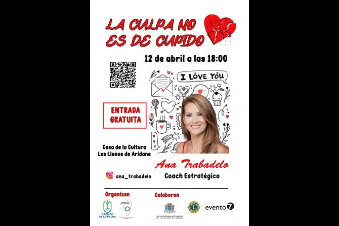 El primer encuentro, que tendrá lugar el viernes 12 de abril, a las 18:00 horas, en la Casa de la Cultura de Los Llanos de Aridane, se desarrollará bajo el La culpa no es de Cupido y se dirige al público en general que quiera conocer de mano de la actriz y presentadora las complejidades de las relaciones interpersonales, especialmente amorosas. La entrada es gratuita y quienes deseen acudir podrán apuntarse mediante el formulario https://forms.office.com/pages/responsepage.aspx?id=seOKT6WRHUyC_Bs5hqBCBJggUCGQclVAo2pfBz-HXcBUMDJVMldJSzM2SFlCSjFMNlo2SzRSQlRUUy4u&origin=QRCode&qrcodeorigin=presentation.
