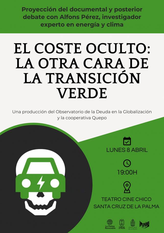 Para el debate posterior, se contará con la presencia de Alfons Pérez, investigador del Observatorio de la Deuda en la Globalización, que ha publicado diversos trabajos donde analiza críticamente la transición ecológica que propone la UE, porque no tiene en cuenta los impactos externos que generaría ni los límites materiales del mundo y, fundamentalmente, puede favorecer grandes empresas. El autor pasará unos días en La Palma para conocer las diferentes iniciativas impulsadas por La Palma Renovable para desarrollar una transición energética justa en la isla.