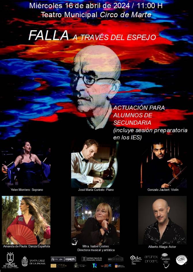 El concierto ‘Falla a través del espejo’ está concebido como un espectáculo musical que contará con el concurso de varios artistas como el actor madrileño Alberto Aliaga, que ha formado parte del lenco de musicales como ‘El hombre de la Mancha’, ‘CATS’, ‘La Bella y la Bestia’, ‘Los Miserables’, ‘El Médico’ o la producción canaria ‘Pecados, el cabaret de la carne’; la bailaora grancanaria de ascendencia gaditana Amanda de Paula; la soprano cubana Yelen Montero; el pianista canario José María Curbelo, que ha desarrollado una intensa y experimentada labor como concertista y profesor de piano, desarrollando su actividad en numerosos países de Europa, América del Sur y en EEUU, y el violinista Gonzalo Jaubert, profesor de violín del Conservatorio Superior de Música de Canarias y director de la Banda y Academia Municipal de Música de los Llanos de Aridane.