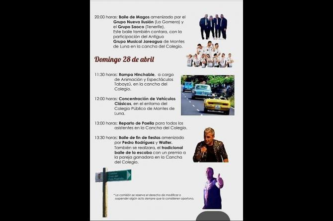 Los actos continúan el sábado, 27 de abril, a las 10:00 horas, con una exhibición infantil de lucha canaria por parte del Club de Lucha San Blas en el Colegio Público de Montes de Luna. A las 17:00 horas, tendrá lugar la Romería Típica desde el entorno de la Cruz, recorrido por el Camino del Palo Podrido y llegada al Colegio todo ello, acompañado por la Parranda Trapiche, la Agrupación Folclórica Aduares de Breña Alta y todas las parrandas que quieran participar. A las 20:00 horas se celebrará el Baile de Magos amenizado por el Grupo Nueva Ilusión de La Gomera, el Grupo Saoco de Tenerife y el Grupo Musical Jareagua de Montes de Luna en la cancha del Colegio.