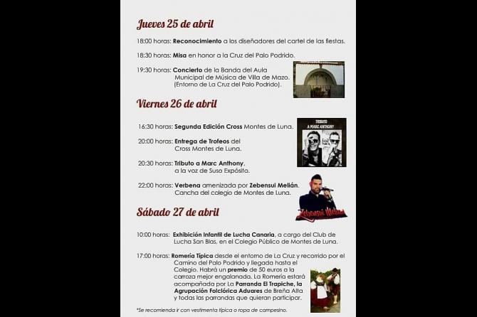 El viernes, 26 de abril, a las 16:30 horas, se celebrará la segunda edición del Cross Montes de Luna con la posterior entrega de trofeos a los ganadores a las 20:00 horas. A las 20:30 horas tendrá lugar el Tributo a Marc Anthony a la voz de Suso Expósito. Para finalizar, a las 22:00 horas, se celebrará la verbena amenizada por Zebensui Melián en la cancha del Colegio Montes de Luna.