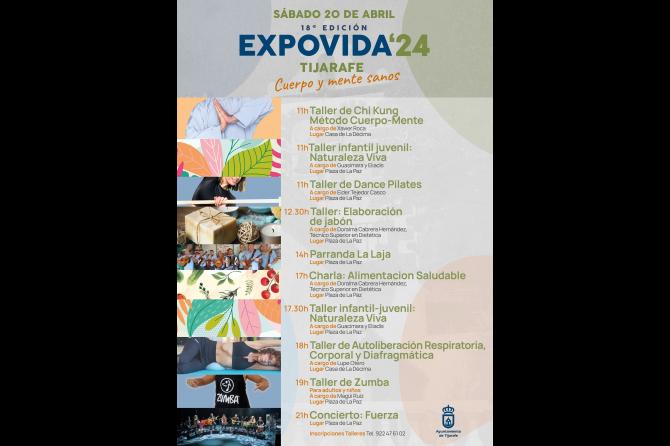 A las 12:30 horas, en la Plaza de La Paz también tendrá lugar el taller de elaboración de jabón, impartido por Doralma Cabrera Hernández. A las 14:00 horas será el momento de disfrutar de la actuación de Parranda La Laja. A las 17:00 horas Guasimara y Eliadis volverán a impartir el taller infantil-juvenil Naturaleza viva y a las 18:00 horas la Casa de la Décima acogerá el taller de autoliberación respiratoria, corporal y diafragmática, a cago de Lupe Otero. La jornada de talleres acabará en la Plaza de La Paz con una sesión de zumba para adultos y niños, impartida por Magüi Ruiz a las 19:00 horas. La decimoctava edición de Expovida culminará con el concierto Fuerza a las 21:00 horas.