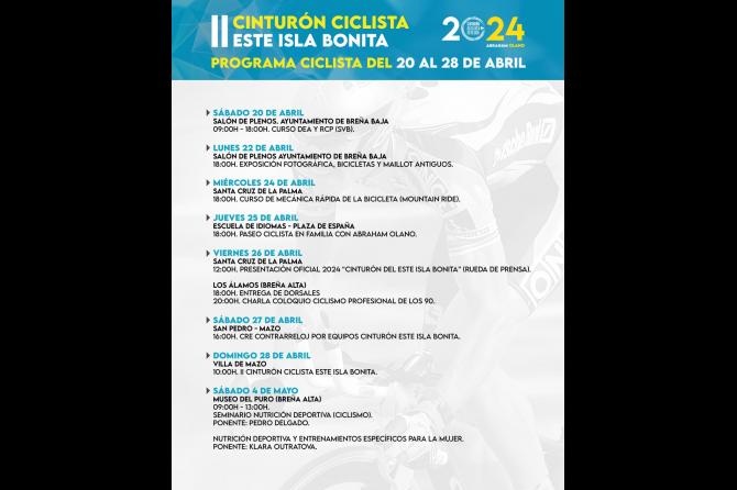 En el programa 2024 del “II Cinturón Ciclista Este Isla Bonita” contara con varias actividades en el municipio de Breña Baja. Entre las misma un Curso DEA y RCP (Primeros Auxilios) el sábado 20 de abril (10 hs) en el salón de plenos del Ayuntamiento de Breña Baja; y la inauguración de la exposición de fotografía de ciclismo y bicicletas antiguas en el mismo lugar el lunes 22 de abril (18 hs) y permanecerá hasta el jueves 25 de abril.