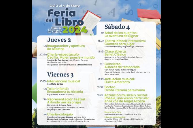 El Ayuntamiento de Los Llanos de Aridane organiza esta edición de la Feria del Libro cargada de literatura y arte. Tendrá lugar entre el jueves, 2 de mayo, y el sábado, día 4, en la Plaza de España. Además de puestos de venta de libros, habrá charlas coloquios, recitales de poesía, música y danza.