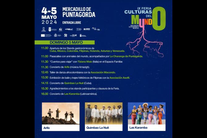 El domingo 5 de mayo toman el relevo en los stands gastronómicos desde las 11:00 horas representantes de Cuba, México, Colombia, Filipinas, Holanda, Asturias y Venezuela. La oferta cultural de esta segunda jornada de la ‘Feria de las culturas del mundo’ continuará con el pasasacalles denominado “con animales del mundo” acompañados por La Charanga de Puntagorda, al que seguirán los “Cuentos para viajar” desde Italia con Tiziana Maio. El concierto de “Arife” y los talleres de danza afrocolombiana a cargo de la Asociación “Macondo”, dan continuidad a las celebraciones del domingo, que se completa con la exhibición de bailes y trajes folclóricos filipinos con la Asociación “Asofil”; la música cubana de “Quimbao La Nuit” y el gran concierto de música latinoaméricana de “Las Karamba” a las 16:00 horas.