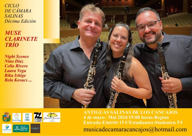 El sábado 4 de mayo, 19 hs, en las Antiguas Salinas de Los Cancajos, tendrá lugar el noveno concierto de la Décima Edición del Ciclo de Cámara Salinas con “Muse Clarinete Trío”.