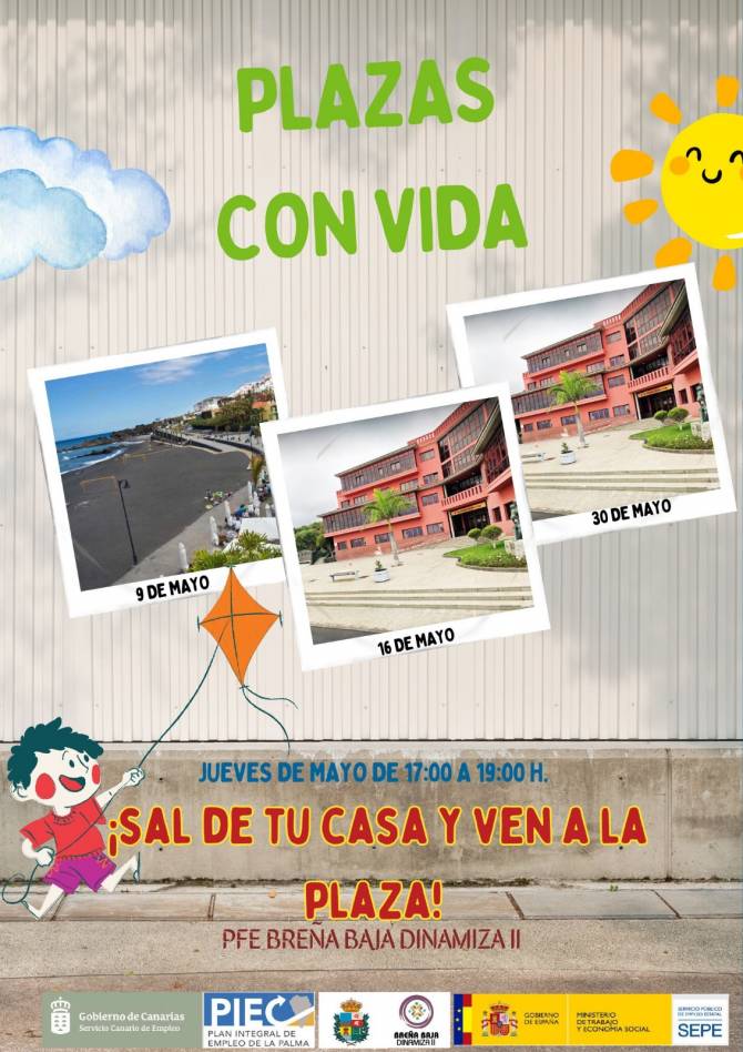 “Plazas con vida” viene funcionando todos los jueves desde el mes de marzo hasta este mes de mayo por las diferentes plazas y espacios públicos del municipio, en horario de 17 a 19 hs. Se cuenta con la colaboración del Ayuntamiento de Breña Baja.