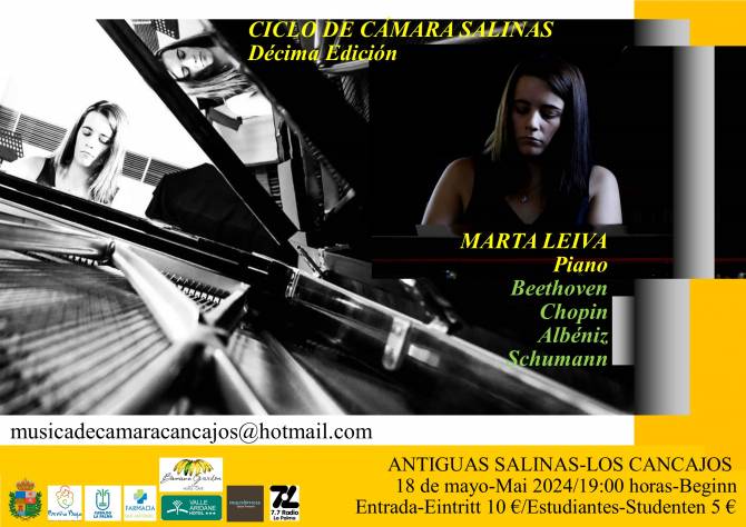 El sábado 18 de mayo a las 19 hs, tendrá lugar el decimo concierto de la Décima Edición del Ciclo de Cámara Salinas en Las Antiguas Salinas de Los Cancajos, con la actuación de Marta Leiva (piano).