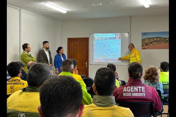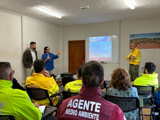 El simulacro ha dado comienzo en la base de la Eirif, en Breña Alta, donde un agente de Medio Ambiente del Cabildo de La Palma ha explicado a los efectivos cómo es la zona y cómo se debe actuar en la misma, atendiendo a las características del territorio y de los propios recursos con los que se cuentan en ella.