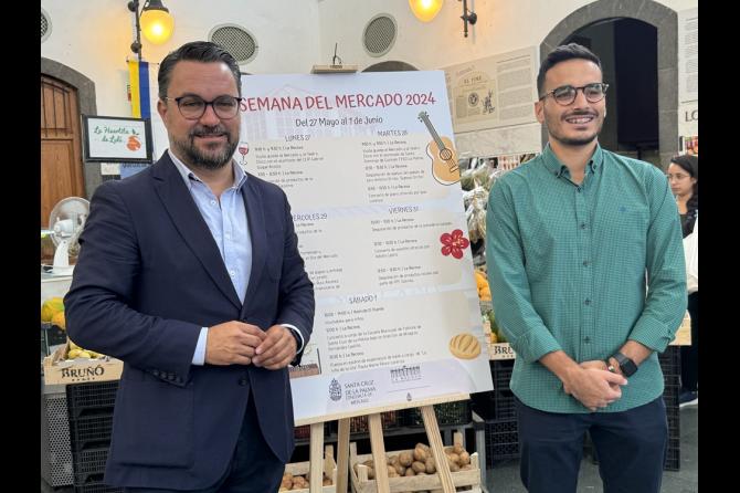 El alcalde de Santa Cruz de La Palma, Asier Antona, y el concejal de Mercado, Jesús Pérez, presentaron este lunes, 27 de mayo, la programación prevista hasta el próximo sábado, 1 de junio, en La Recova, un espacio emblemático que cuenta 138 años de vida.