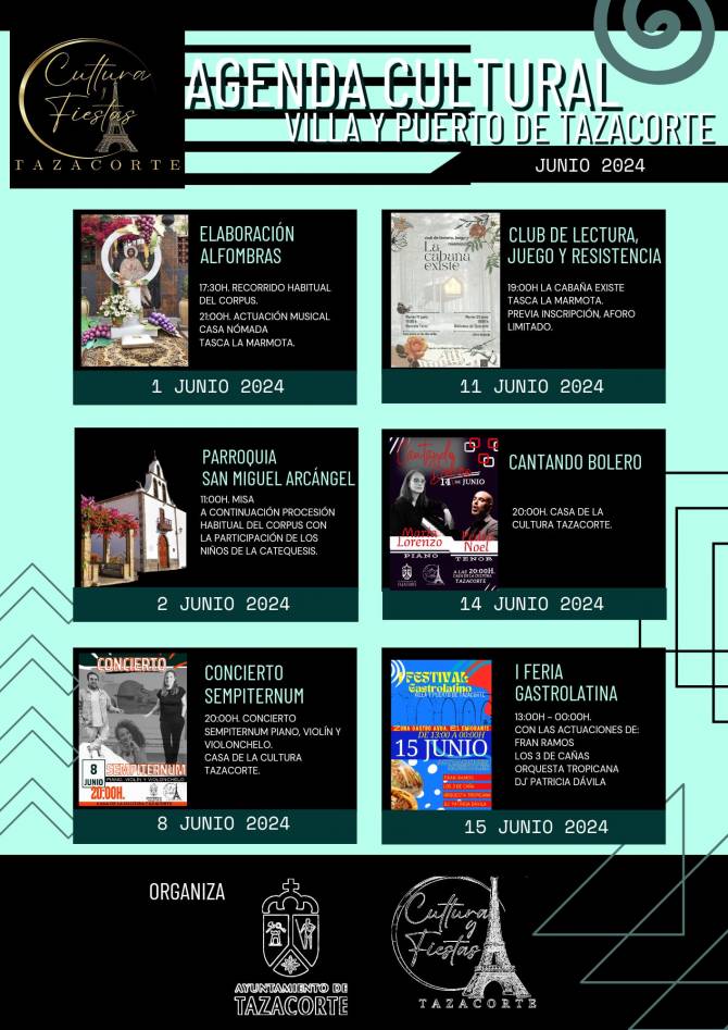 El 14 de junio, la Casa de la Cultura de Tazacorte será escenario de "Cantando Bolero", un evento musical que comenzará a las 20:00 horas. Mientras que el 15 de junio se celebrará la I Feria Gastrolatina, un evento que ofrecerá música en vivo en la zona gastro de la Avenida El Emigrante desde las 13:00 hasta la medianoche, con actuaciones de Fran Ramos, Los 3 de Cañas, Orquesta Tropicana y DJ Patricia Dávila.