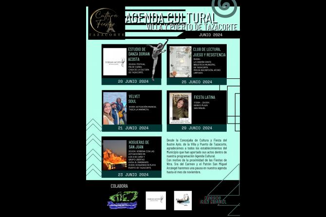 El Estudio de Danza Dorian Acosta presentará su festival de fin de curso el 20 de junio a las 20:00 horas en la Casa de la Cultura de Tazacorte. El 21 de junio, a las 21:00 horas, Velvet Soul ofrecerá una actuación musical en la Tasca La Marmota.