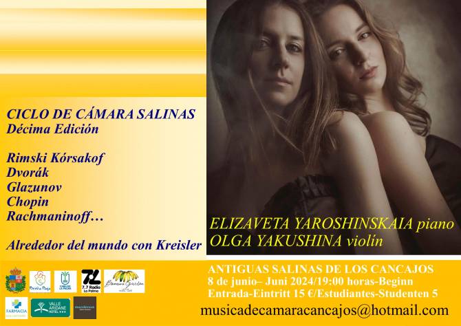 El sábado 8 de junio a las 19 hs, tendrá lugar el duodécimo concierto de la décima edición del Ciclo de Cámara Salinas en las Antiguas Salinas de Los Cancajos, con la actuación de dúo formado por Elizaveta Yaroshinskaia (piano) y Olga Yakushina (violín),y bajo el titulo de “Alrededor del mundo con Kreisler”.