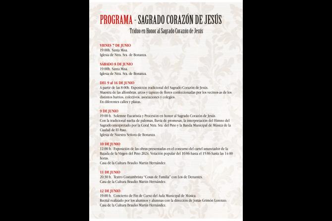 19:00 h. Solemne Eucaristía y Procesión en honor al Sagrado Corazón de Jesús. Con la tradicional suelta de palomas, lluvia de promesas, la interpretación del Himno del Sagrado interpretado por la Coral Ntra. Sra. del Pino y la Banda Municipal de Música de la Ciudad de El Paso.